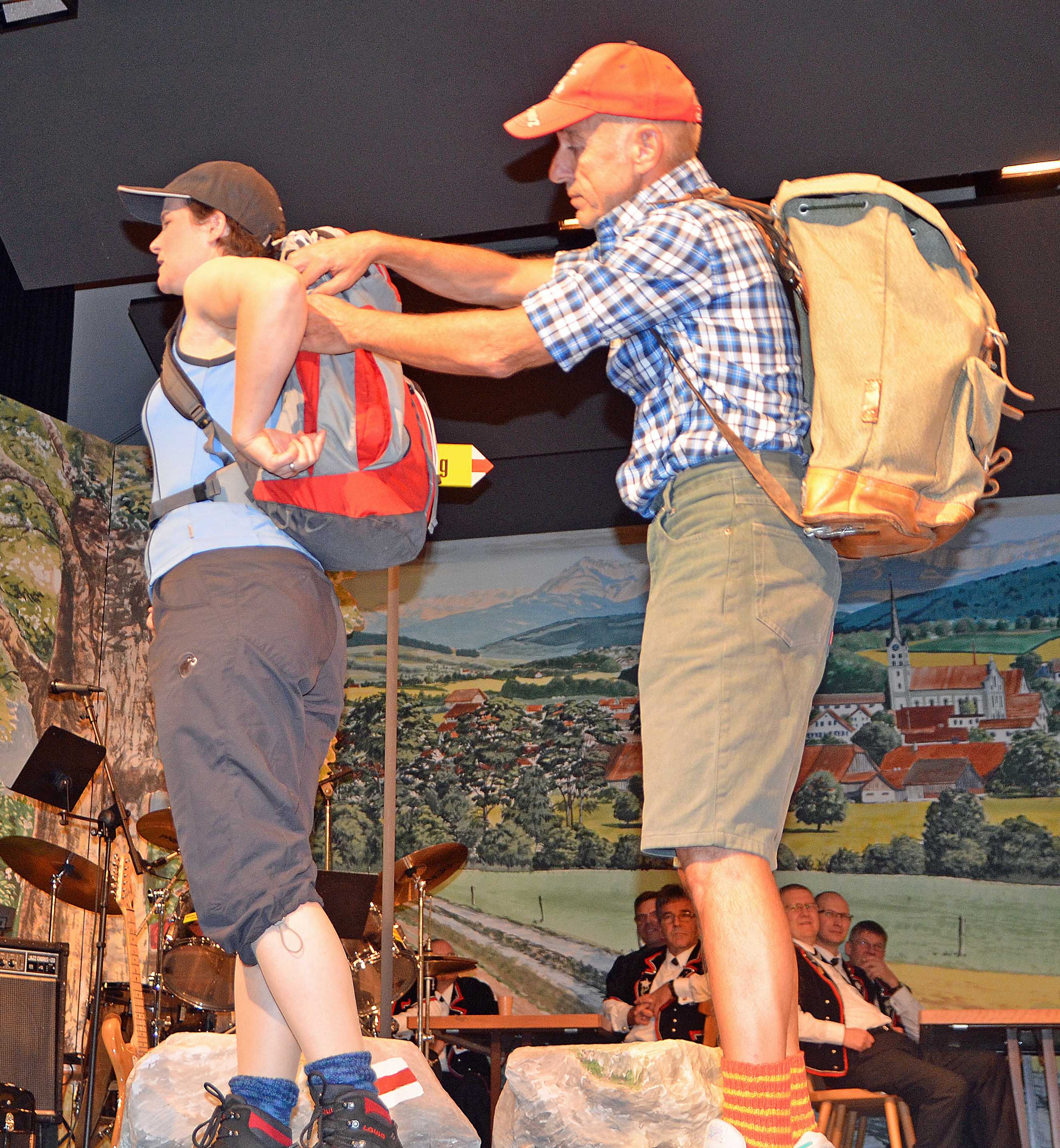 Er hat ihr zum Hochzeitstag versprochen, wieder mal zum Wandern mitzukommen - aber die gute Sicht ist nur dem Fön zu verdanken und schlägt ihm auf den Kopf. Und überhaupt: Er lässt sich doch von niemandem vorschreiben, welche Schuhe er anziehen soll, wandern hin oder her. Dass sie auch für ihn nur ein Salatsandwich mitgenommen hat, obwohl es daheim im Kühlschank noch Schinken und Servelas gehabt hätte, drückt zusätzlich auf die Stimmung...